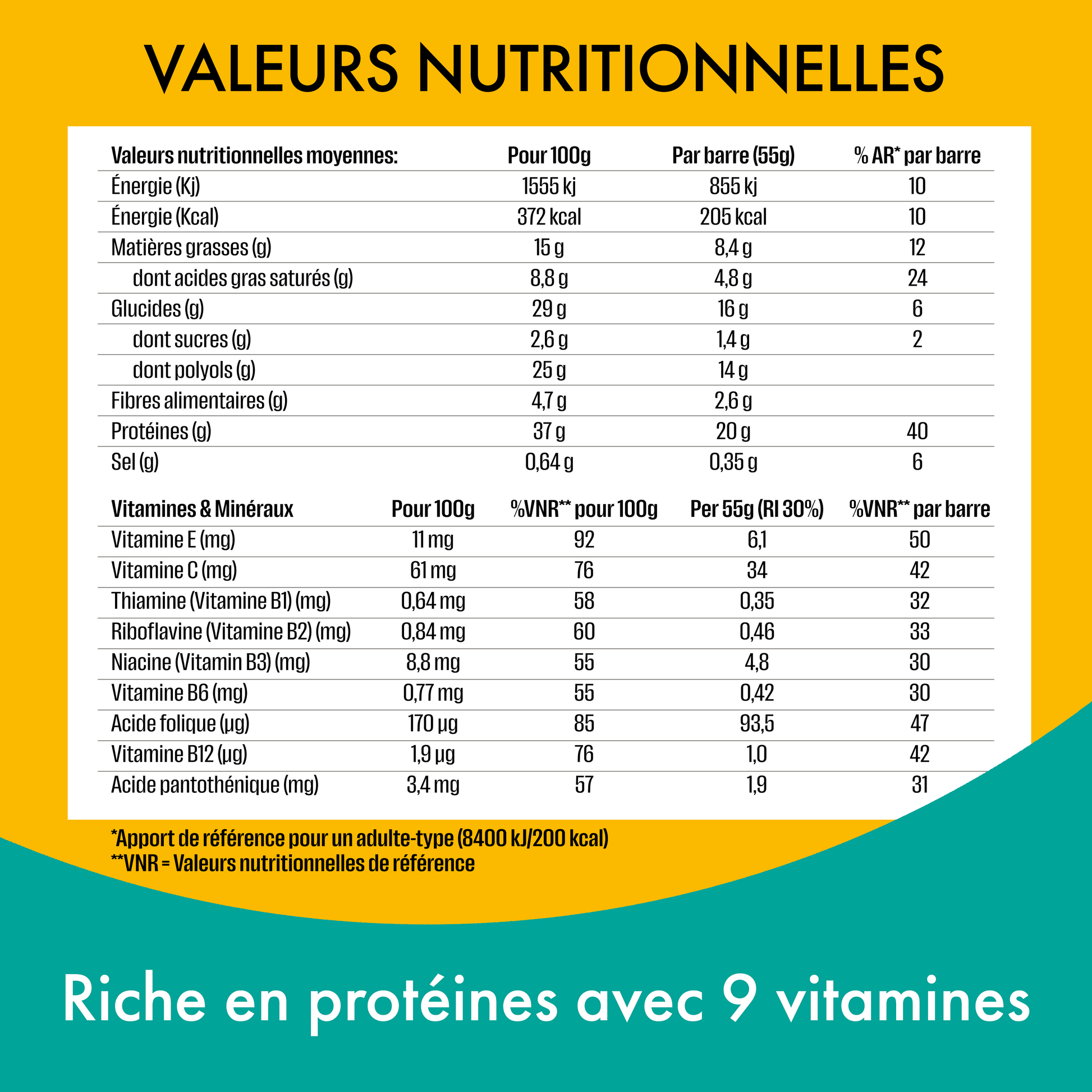 | Valeurs nutritionnelles moyennes: | Pour 100g | Par barre (55 g) |